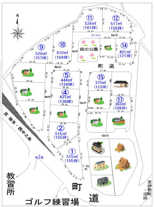 | 角地 ・ 接道 | 分譲地全体の 南側に約12m幅の公道(舗装町道)に 約 30 m接道 東側に約3.5m幅の公道(舗装町道)に 約130m接道 分譲地内部において 西側・北側・中央に約7.5m幅の公道(舗装町道)に接道 |