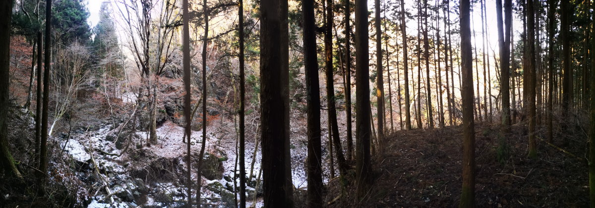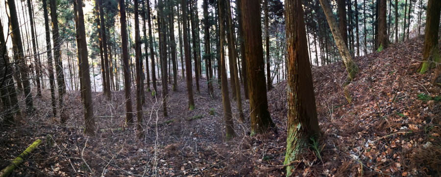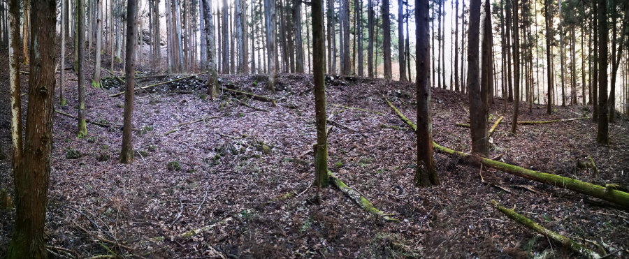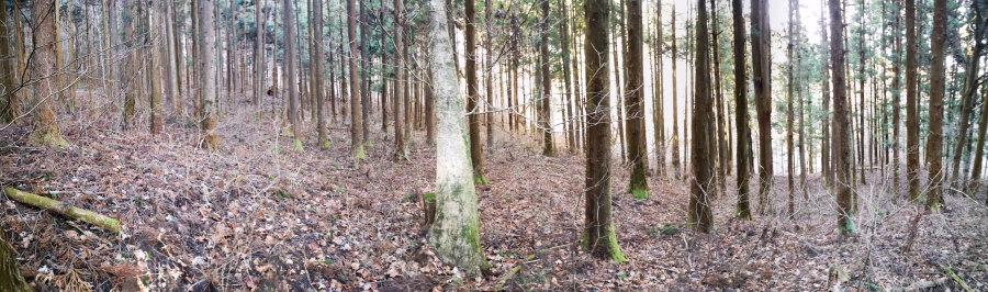 川沿いの奥にある山林(杉林)です。真ん中に見えるのは、丘?のようなものがあります。
